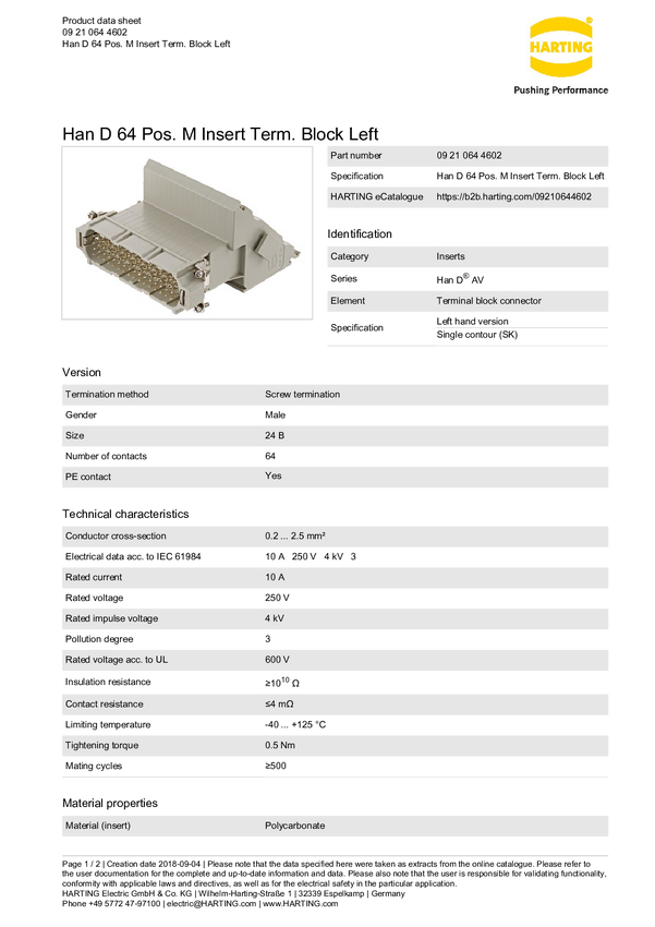Wkładka złącza męskiego Harting 09210644602 09 21 064 4602, 1 szt.
