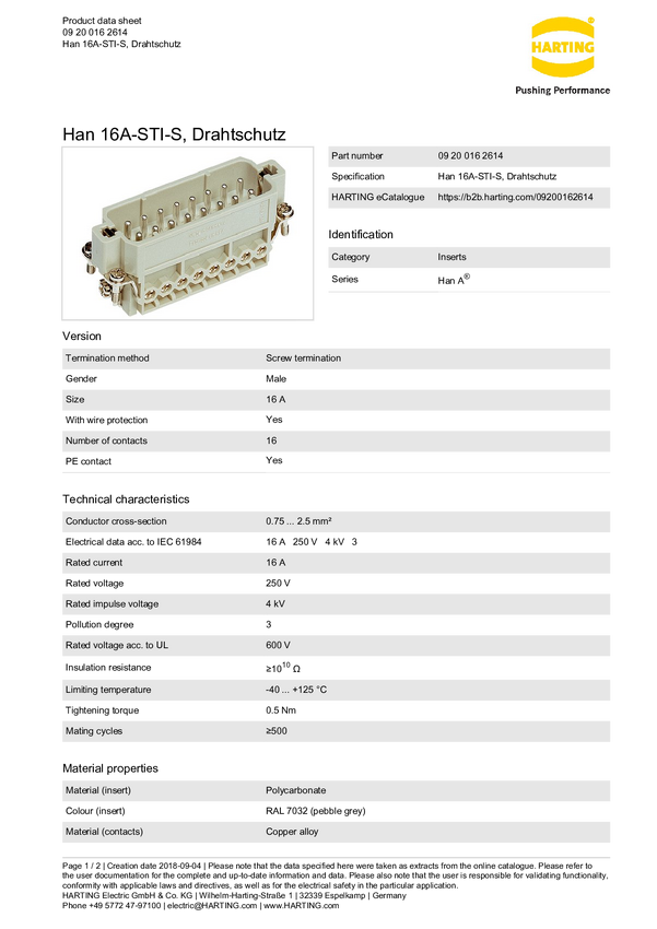 Wkładka złącza męskiego Harting 09200162614 09 20 016 2614, 1 szt.