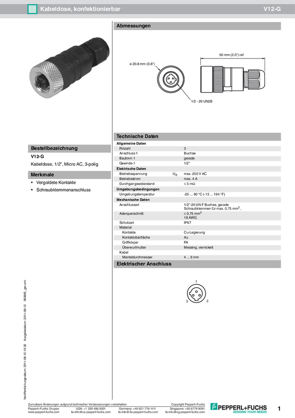Pepperl+Fuchs 093865 Gniazdo kablowe złącze żeńskie proste Ilość pinów: 3 1 szt.