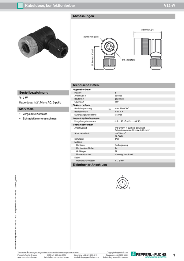 Pepperl+Fuchs 093866 Gniazdo kablowe złącze żeńskie kątowe Ilość pinów: 3 1 szt.