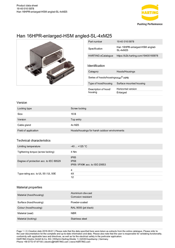 Obudowa podstawowa Harting 19 40 016 0978, odlew aluminium, 1 szt.