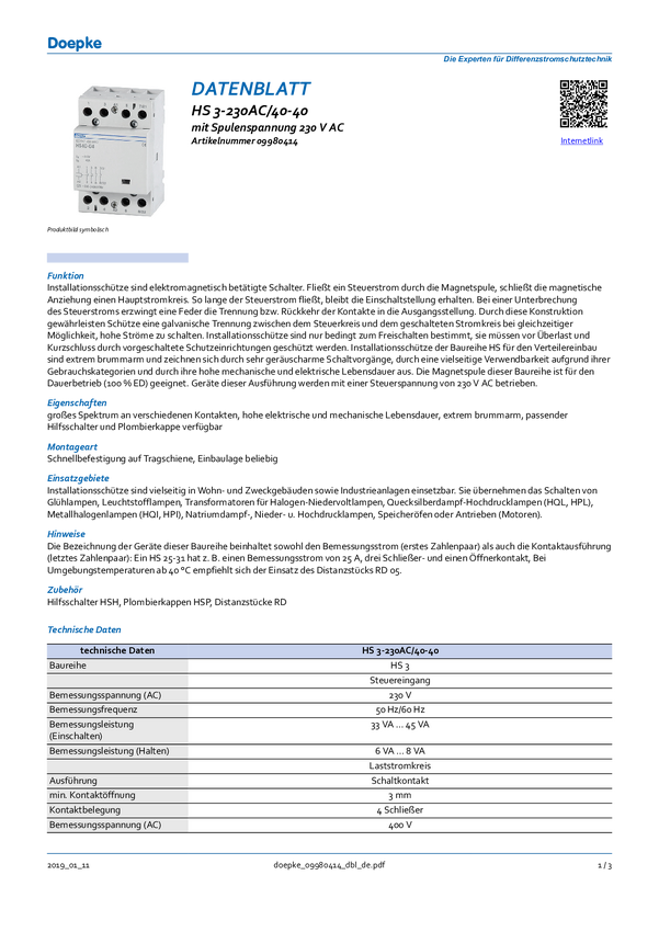 Stycznik Doepke HS25-40 09980408, 4 styki, 230 V, 1 szt.