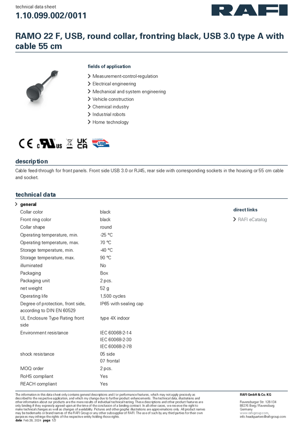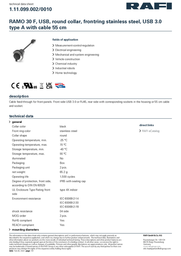 Złącze USB adapter RAMO 30 F 1.11.099.002/0010 RAFI Zawartość: 1 szt.