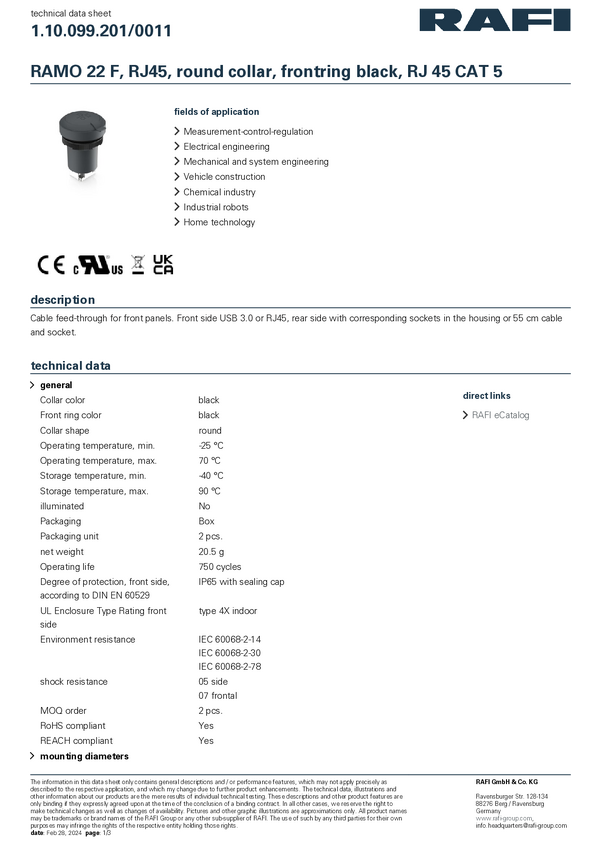 RAFI RAMO 22 F złącze żeńskie do wbudowania RAFI RAMO 22 F 1.10.099.201/0011 złącze żeńskie do wbudowania czarny 1 szt.