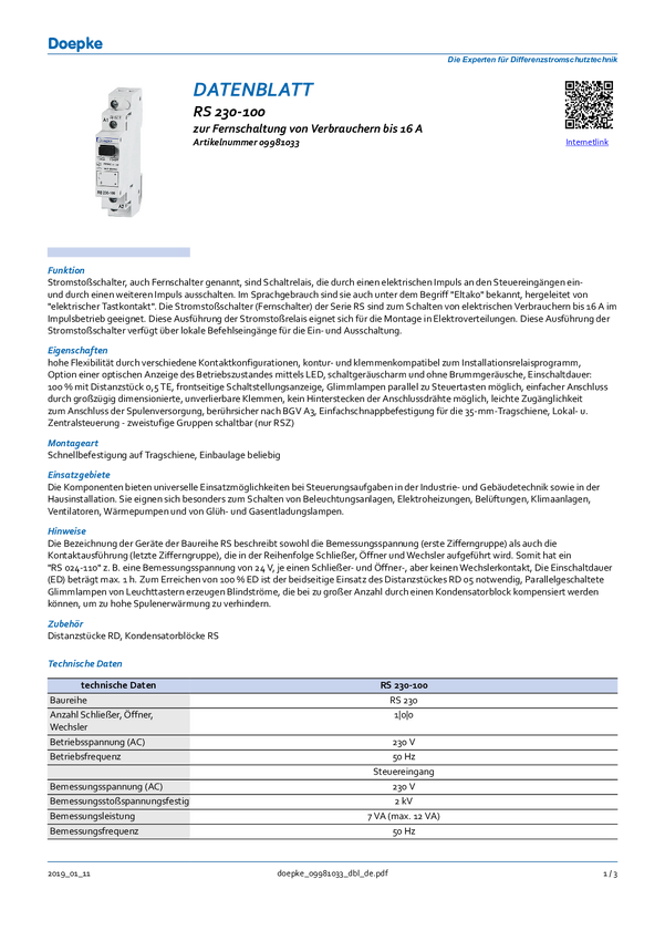 Przełącznik zdalny Doepke RS 230-100 1S 230V 1 NO 230 V 1 szt.