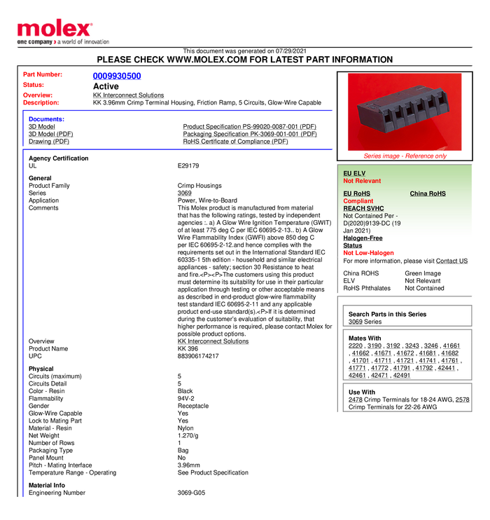 Molex 09930500 Obudowa złącza pin męskiego na kabel 1 szt.