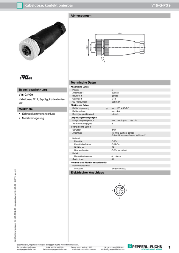 Pepperl+Fuchs 099774 Gniazdo kablowe M12 złącze żeńskie proste Ilość pinów: 5 1 szt.