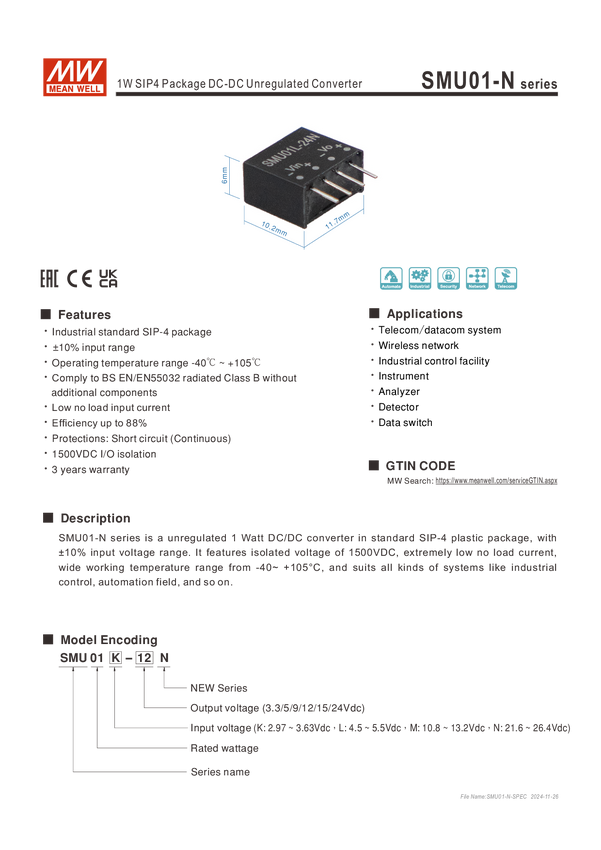 MEAN WELL SMU01L-09N Przetwornica DC/DC 0.111 A Ilość wyjść: 1 x Content 1 szt.