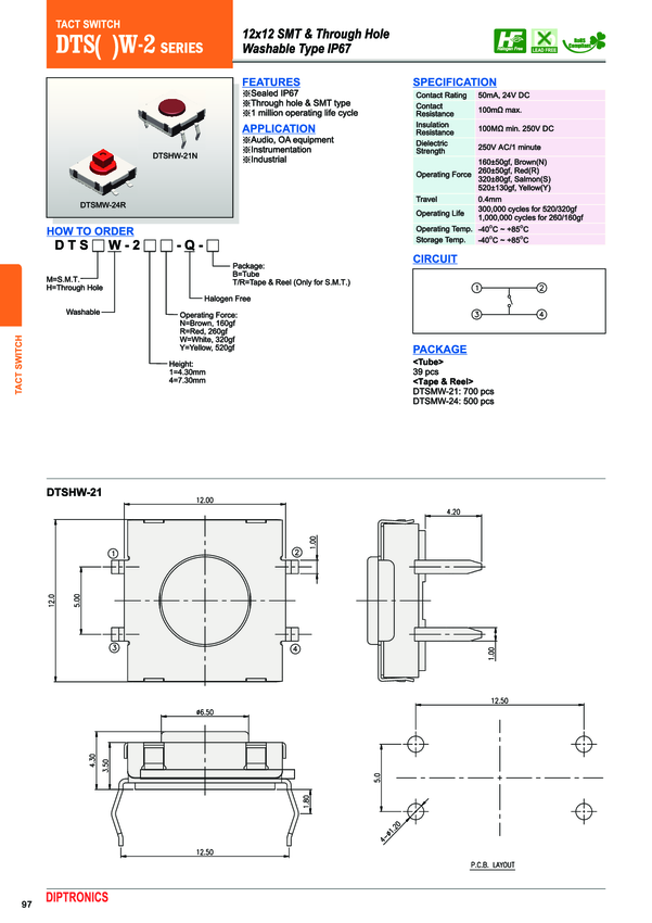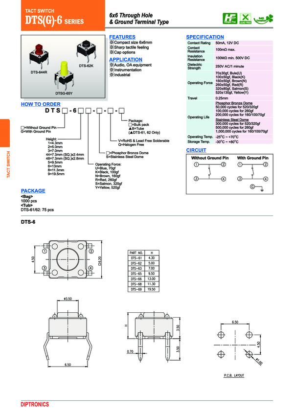 Switch Tactile N.O. SPST Round Button PC Pins 0.05A 12VDC 50000Cycle 5.09N Thru-Hole Bulk