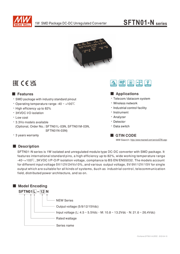 MW Mean Well SFTN01L-09N Przetwornica DC/DC, do SMD 111 mA 1 W Ilość wyjść: 1 x Content 1 szt.