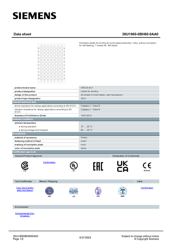 Tablica opisowa Siemens 3SU1900-0BH60-0AA0 490 szt.