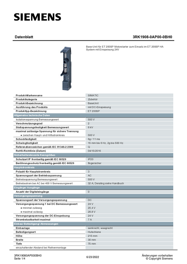 Siemens 3RK1908-0AP00-0BH0 3RK19080AP000BH0 Jednostka bazowa 500 V Natężenie znamionowe 32 A