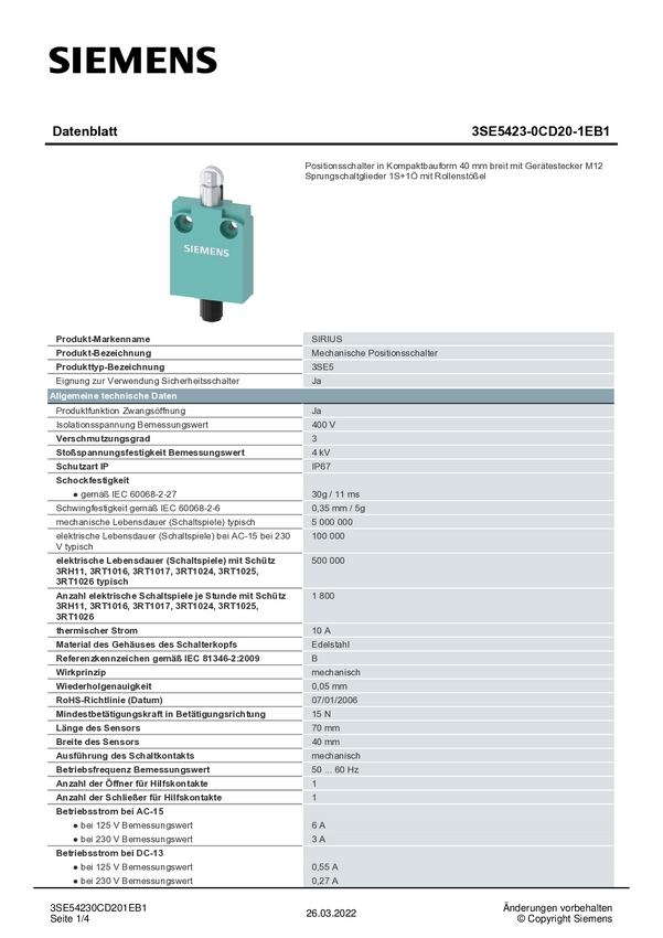 Siemens 3SE52340CD031AJ1 Przełącznik pozycyjny 3SE5234-0CD03-1AJ1, 1 szt.