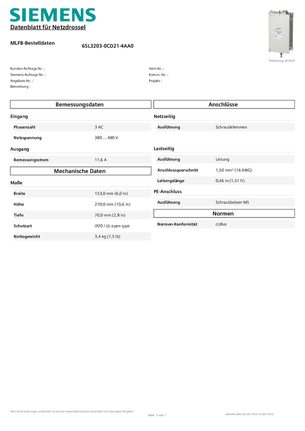 Dławik liniowy Siemens 6SL3203-0CD21-4AA0 6SL32030CD214AA0 11.6 A 1 szt.
