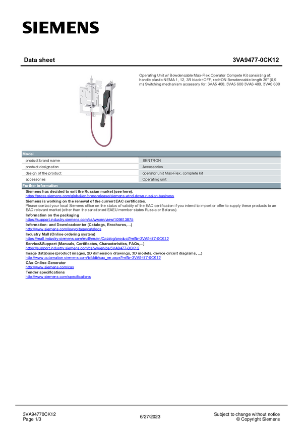 Jednostka operacyjna Siemens 3VA9277-0CK12 1 szt.