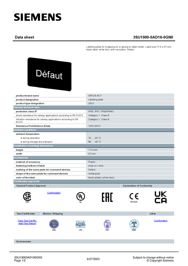 Tabliczka opisowa Siemens 3SU1900-0AD16-0GN0 10 szt.