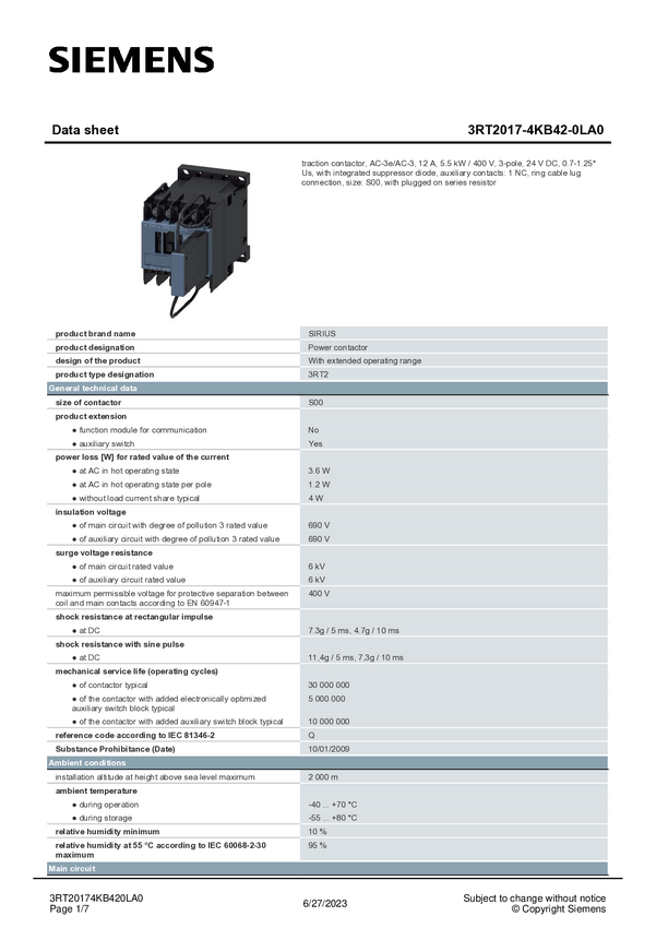 Stycznik Siemens 3RT2017-4KB42-0LA0 3RT20174KB420LA0, 1 szt.