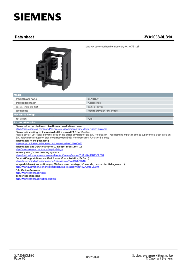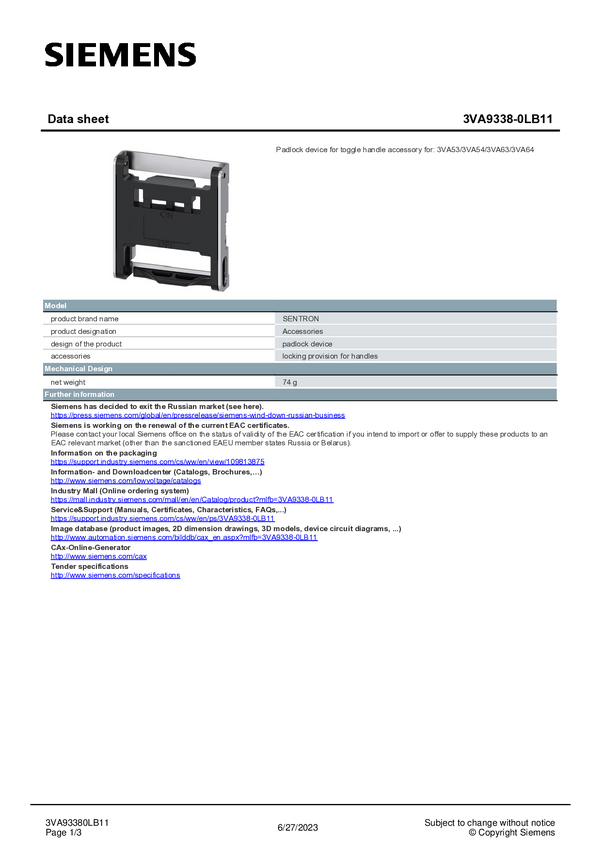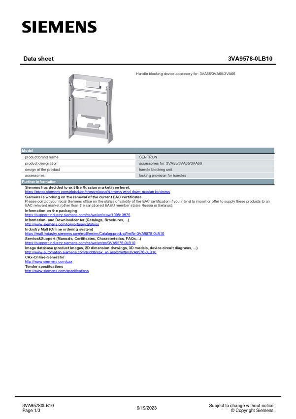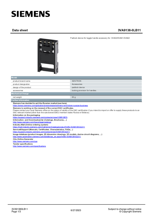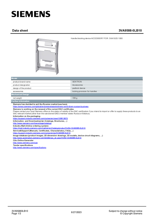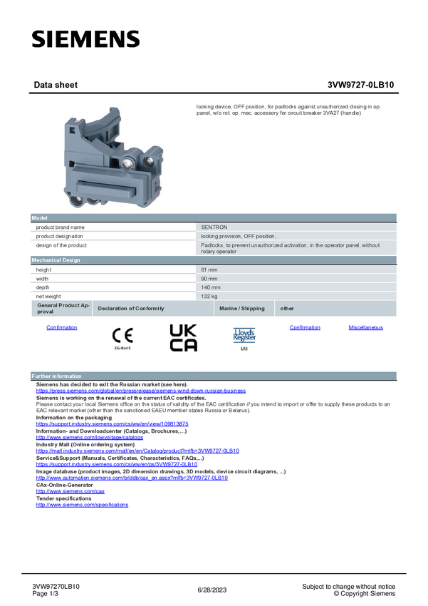 Urządzenie blokujące Siemens 3VW9727-0LB10 1 szt.