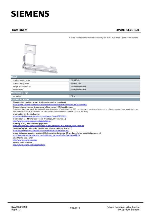 Zestaw akcesoriów Siemens 3VA9033-0LB20 1 szt.