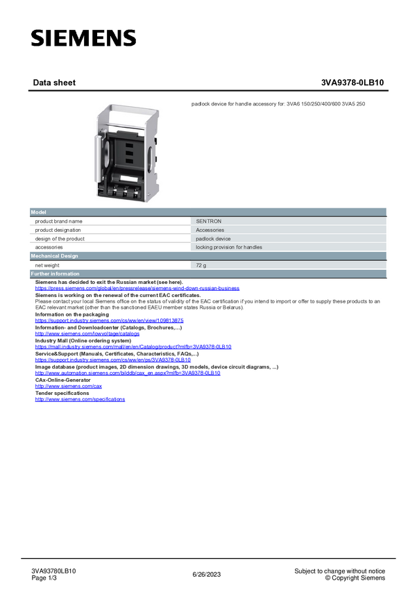 Urządzenie blokujące Siemens 3VA9378-0LB10 1 szt.