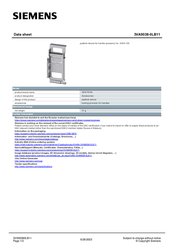 Urządzenie blokujące Siemens 3VA9038-0LB11 1 szt.