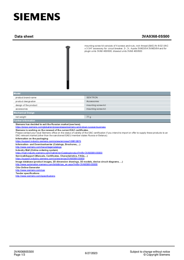 Zestaw akcesoriów Siemens 3VA9368-0SS00 1 szt.