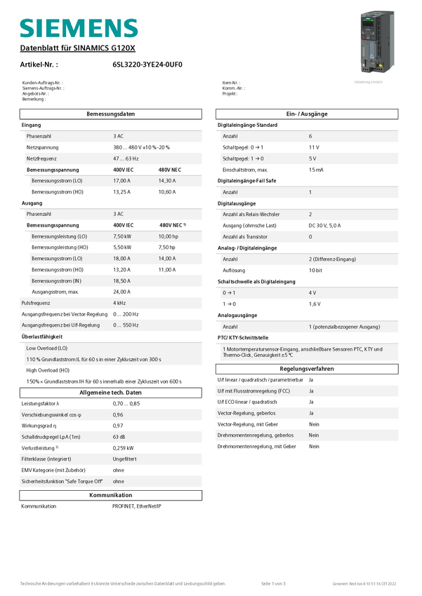 Przemiennik częstotliwości Siemens 6SL3220-3YE24-0UF0 7.5 kW 480 V, 380 V
