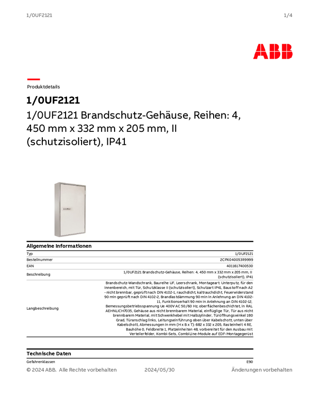 Striebel & John 2CPX040053R9999 1/0UF2121 Szafka ścienna przeciwpożarowa podtynkowy Ilość rzędów = 4 Content 1 szt.