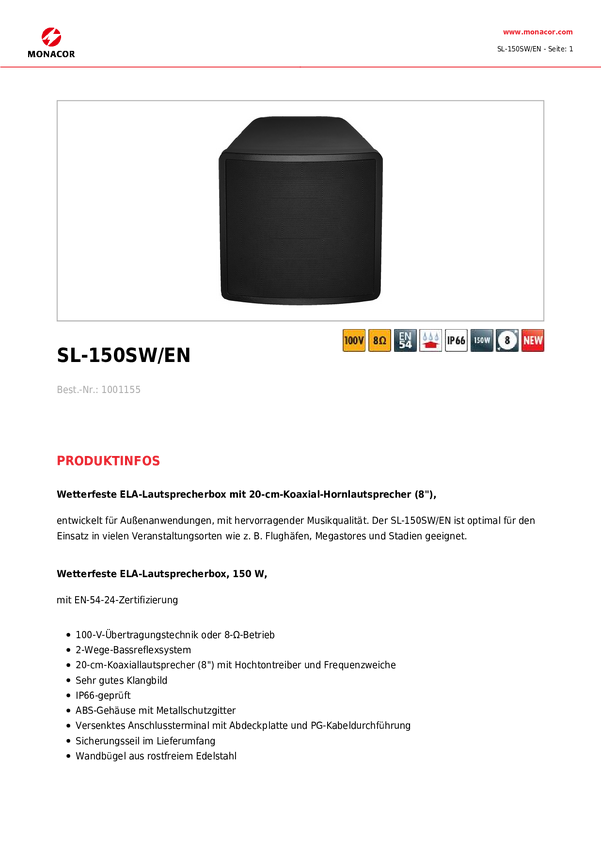 Monacor SL-150SW/EN Głośnik PA 150 W czarny 1 szt.