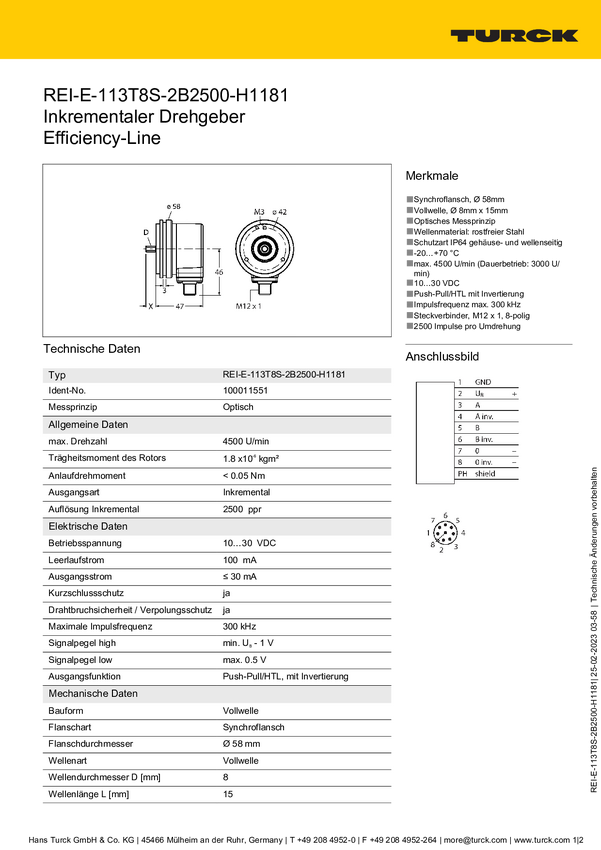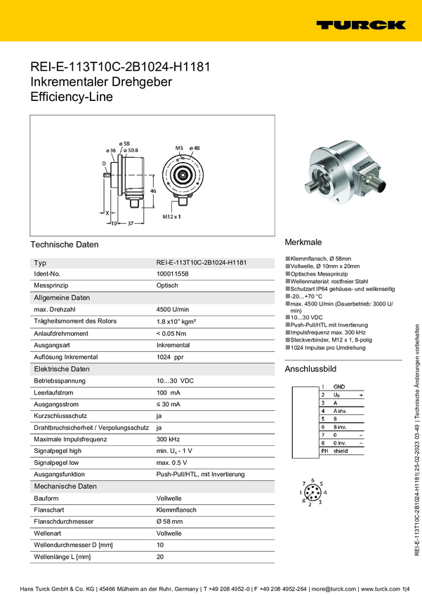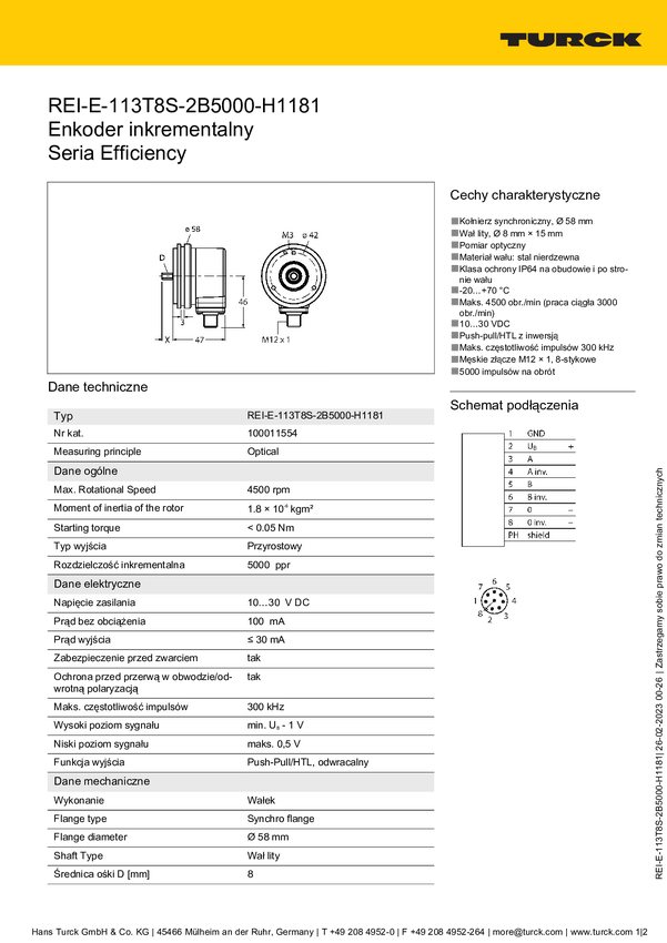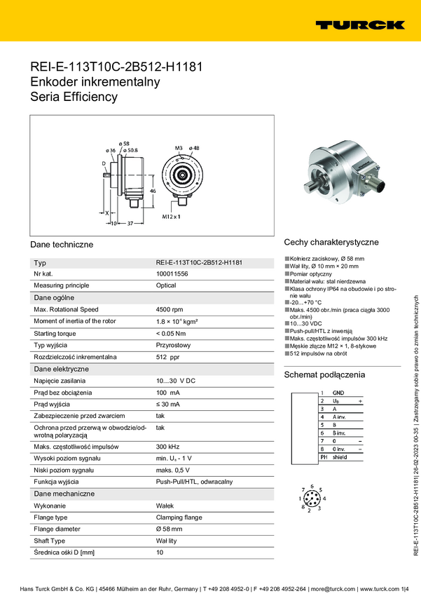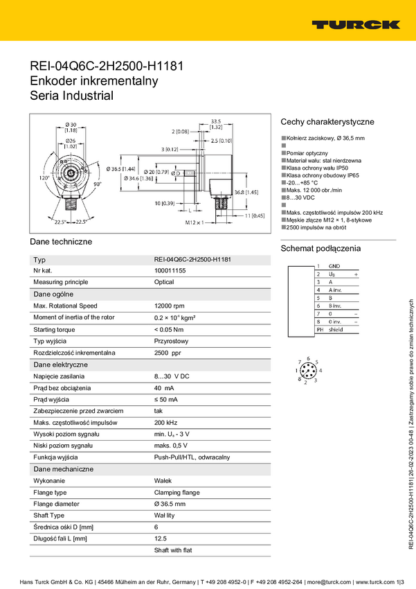 Enkoder obrotowy inkrementalny Turck 100011155 Optyczny
