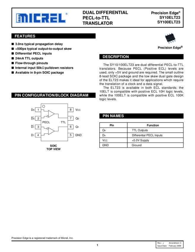 SY10/100ELT23 - Dual Differential PECL-to-TTL Translator (11/11/2015)