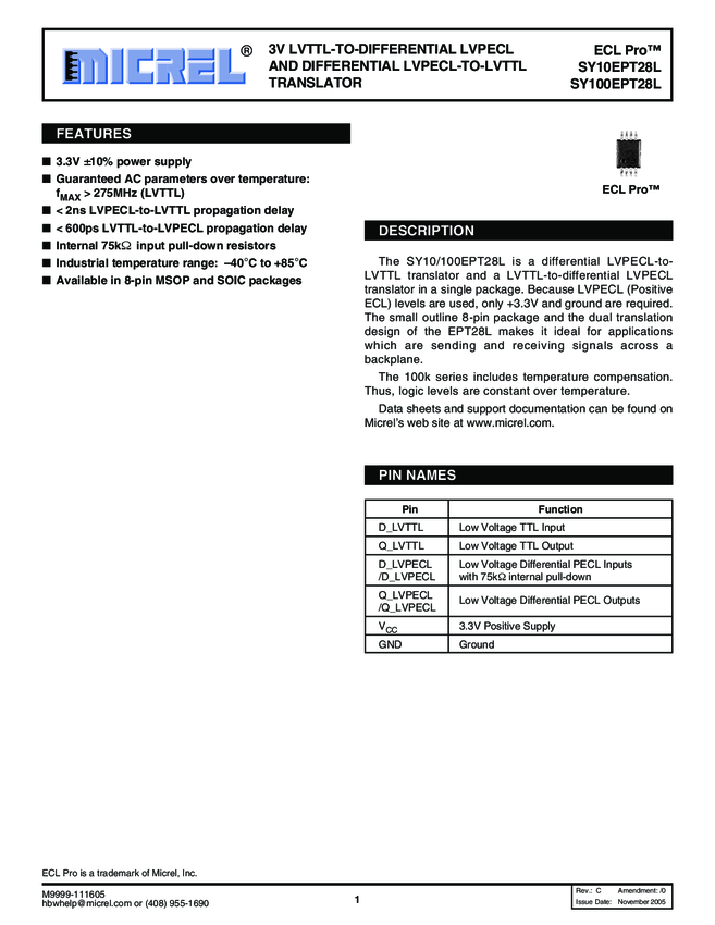 SY10/100EPT28L - 3V LVTTL-TO-Differential LVPECL and Differential LVPECL-TO-LVTT