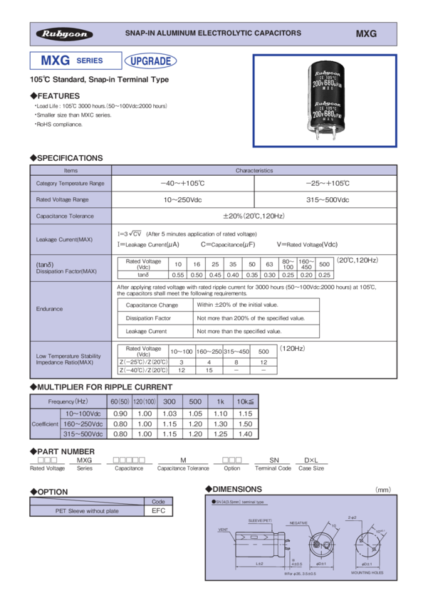 CAPACITOR, Aluminum Electrolytic, Snap In, VXG Series, Cylindrical Can, 100Vdc, 1000µF, ±20%, PET Sleeve, ø25x30mm long