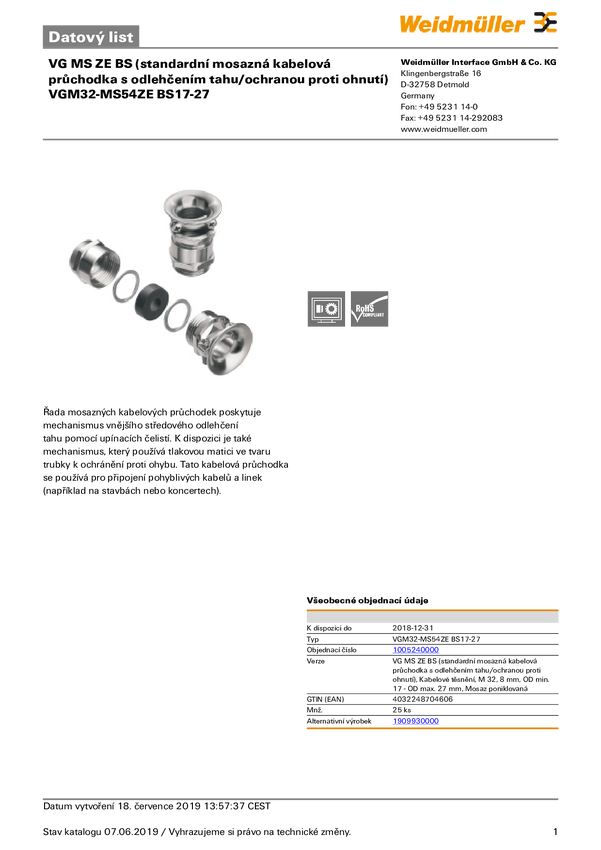 Weidmüller 1005240000 Dławnica kablowa M32 mosiądz mosiądz 25 szt.