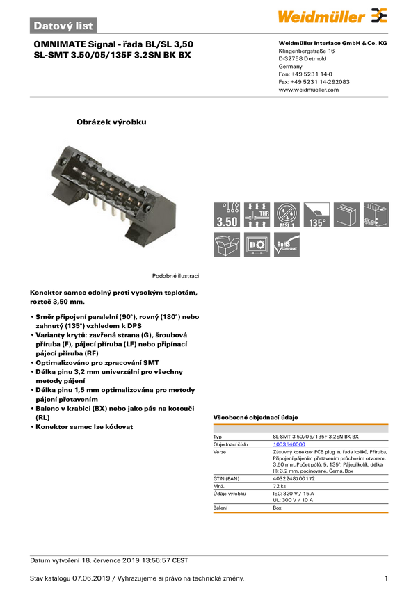 Weidmüller Obudowa złącza pin męskiego na PCB BL/SL Ilość pinów 5 Wymiary siatki: 3.50 mm 1003540000 50 szt.