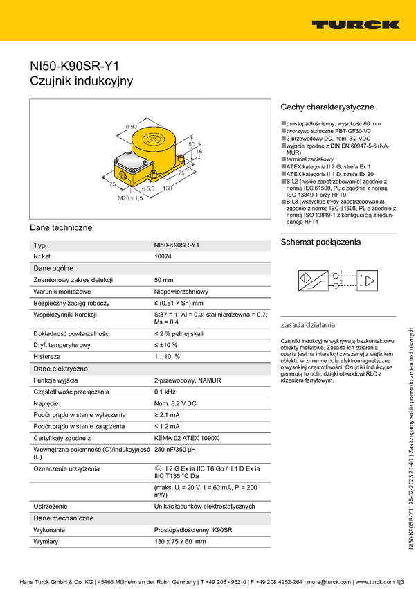 Turck Czujnik indukcyjny nie podtynkowy NAMUR NI50-K90SR-Y1