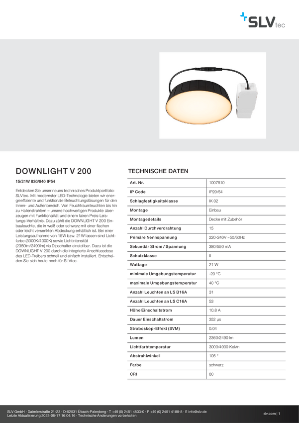 Oświetlenie wewnętrzne LED SLV Downlight V 200 1007510 21 W