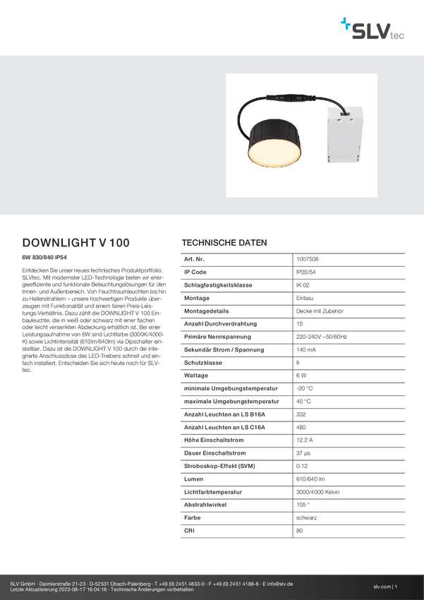 Oświetlenie wewnętrzne LED SLV Downlight V 100 1007508 6 W