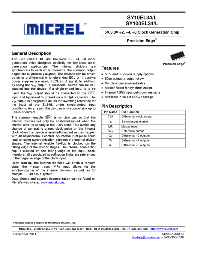 SY10/100EL16V - 3.3V 1:4 Clock Distribution (11/11/2015)