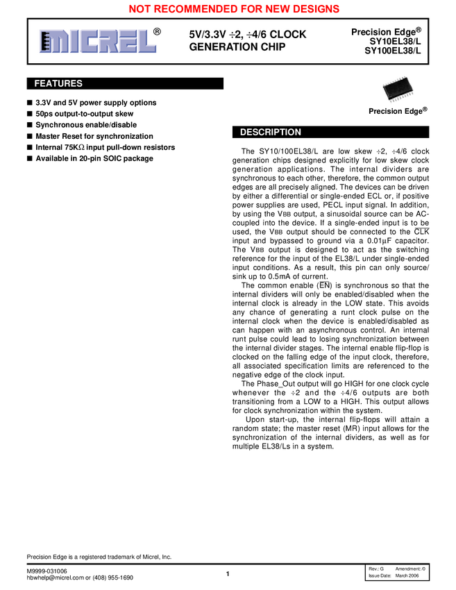 SY10/100EL38 - 5V/3.3V ÷2, ÷4/6 Clock Generation Chip