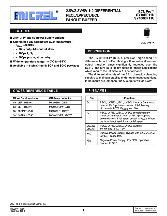 SY10/100EP11U - 2.5V/3.3V/5V 1:2 Differential PECL/LVPECL/ECL Fanout Buffer (11/11/2015)