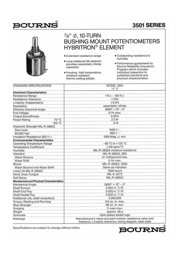 7/8"=22MM,10TURN, 100KOHM HYBRIT AROT ,bushing Potencjometr Hybrid, Bushing; lin.0,2%; tol.=10% 10 obrotowy, średnica =7/8"=22,23mm; długość=1"=25,4mm; ośka =1/4"=6,35mm; trwałość=4.000.000 obr; moc=2W