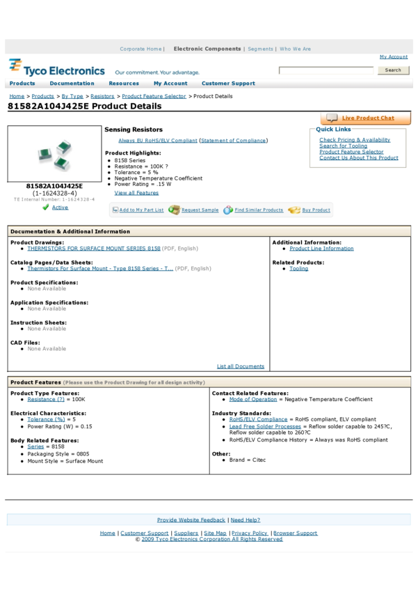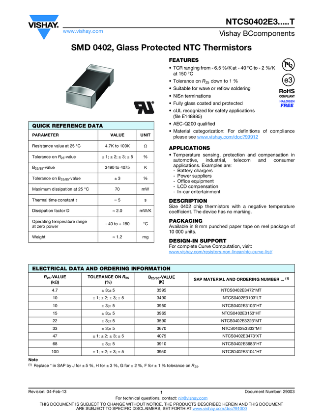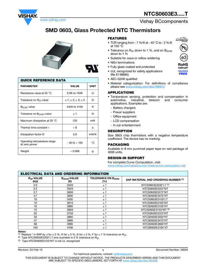 Thermistor NTC 100KOhm 3% 2-Pin 0603 Embossed T/R