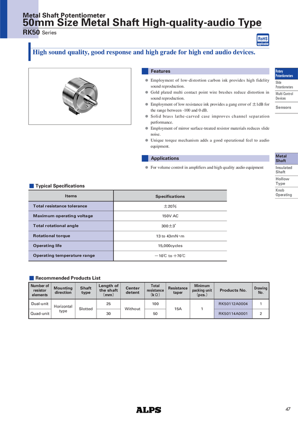 Potencjometr audio Apls-Audiofilski (ostatnie 2 sztuki w sta rej cenie) podwójny S=25mm; bez zapadek, 100kohm, 50mm Metal shaft; high-quality-audio type ( charakterystyka zbliżona do logarytmicznej) Alps Electric Co.,LTD. HQPRO for Audio
