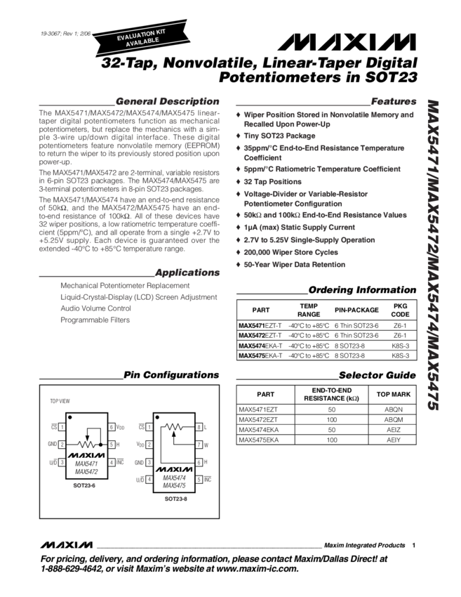 MAX5475 32-Step Nonvolatile Up/Down 100Kohm Potentiometer