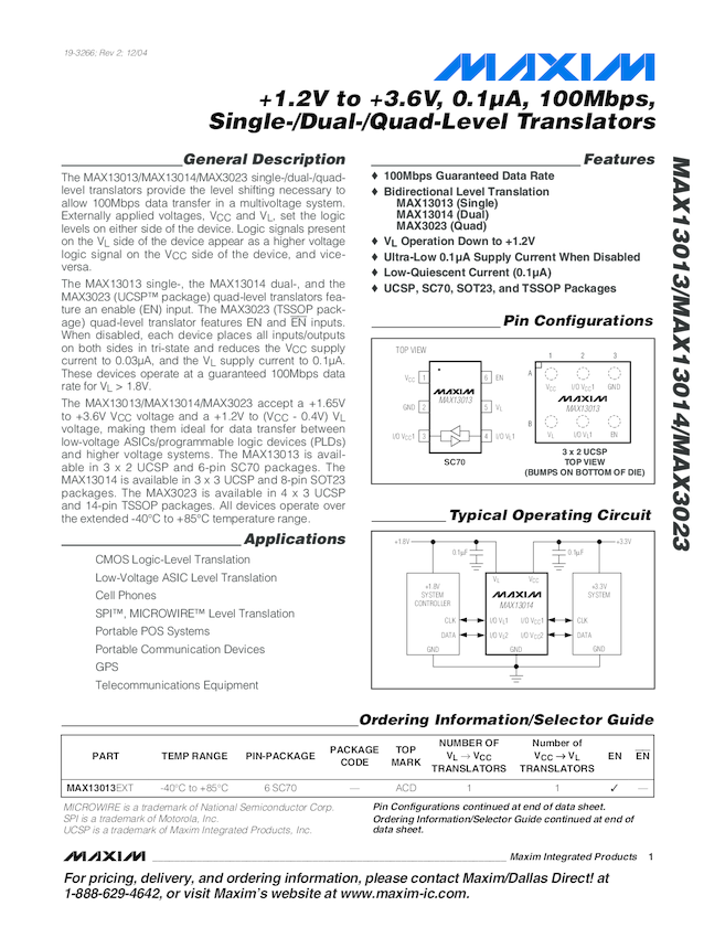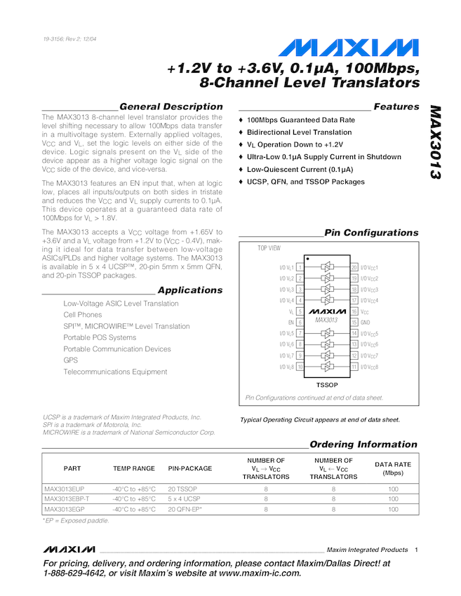 MAX3013 100Mbps, Bi-directional Logic Level Translator