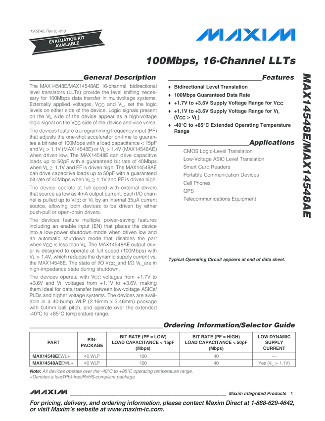 MAX14548E 100Mbps, 16-Channel, Bidirectional LLT