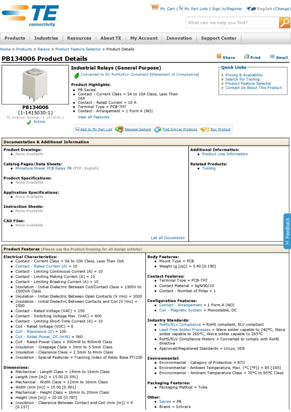 Electromechanical Relay SPST-NO 15A 6VDC 100Ohm Through Hole