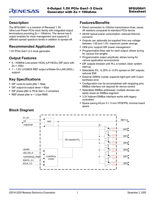 6-Output 1.5V PCIe Gen 1-2-3 Clock Generator with Zo=100ohms