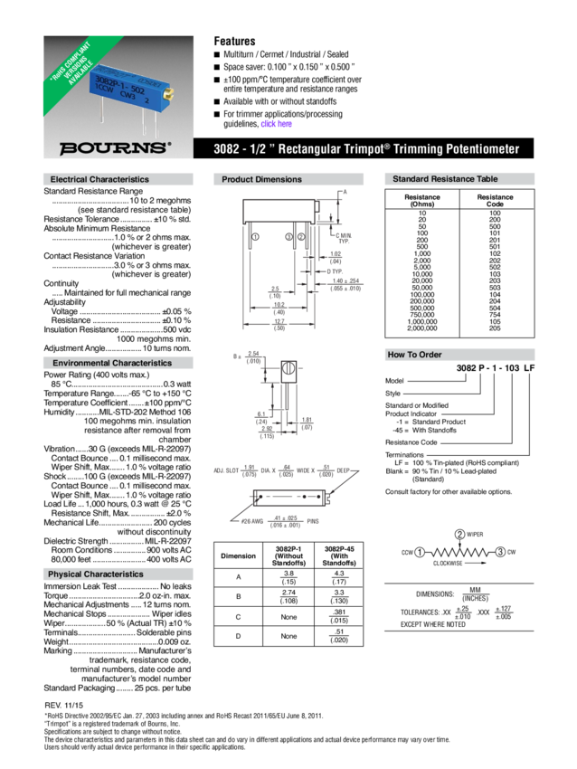Res Cermet Trimmer 2K Ohm 10% 1/4W 12(Elec)Turn 1.78mm (7.37 X 4.32 X 6.35mm) Pin Thru-Hole Tube